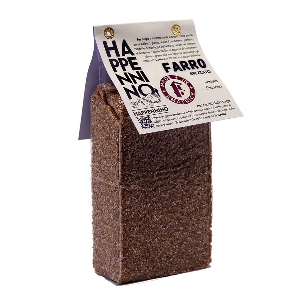 Coltiviamo ciò che ci piace mangiare e il Farro ha sempre per noi rappresentato un gran piacere per il palato grazie al gusto tipico dei grani antichi. Lo seminiamo e raccogliamo alle pendici dei Monti della Laga su terreni d’altura posti a 1000 m. nel comune di Amatrice. Le alte valli appenniniche anche per la loro quota non favorisce la produttività ma certamente ci restituisce un prodotto di alta qualità. Tra i grani antichi il Farro è con ogni probabilità il progenitore di tutti sviluppatosi oltre 10.000 anni fá resistendo alle avversità naturali e alle erbe infestanti e cibo di nutrimento delle legioni romane. Per questo abbiamo scelto di coltivarlo in totale assenza di trattamenti chimici praticando una corretta rotazione con sovesci di erbe e leguminose ed eventuali concimazioni naturali. La versione in grani spezzati offre la possibilità di conservare la gran parte dei nutrienti e nello stesso tempo riduce i tempi di cottura a circa 20 min. e non necessità di ammollo in acqua. Il Farro di Happennino ha un gusto rustico ma elegante e molto più aromatico e delicatamente speziato degli altri grani. Il Farro di Montagna tiene benissimo la cottura per cui ha una ottima consistenza in bocca piacevole e gradita a tutti anche ai bambini.